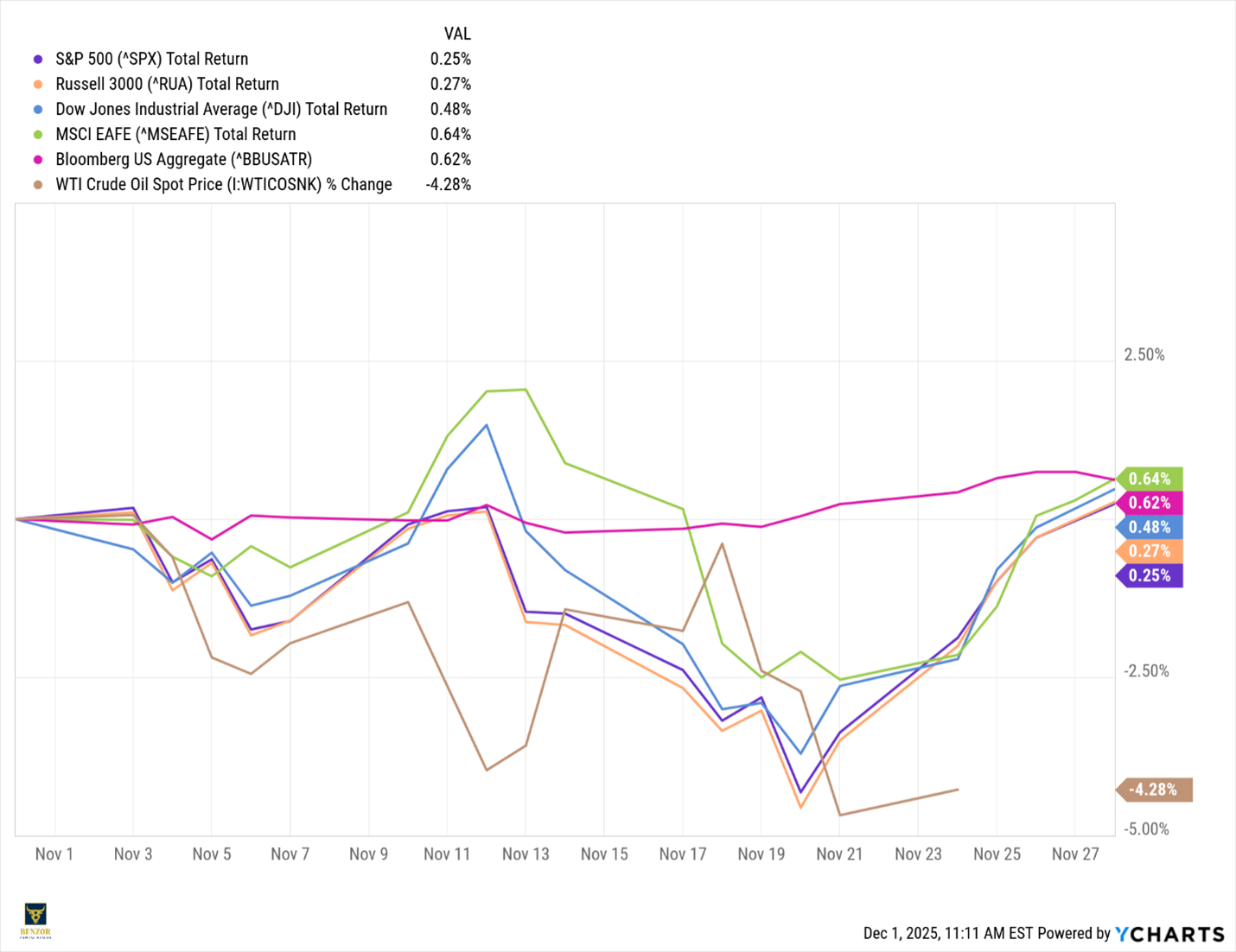 International equities posted modest gains in November, with the MSCI EAFE rising 0.64% for the month. Fixed income delivered positive performance, supported by falling yields as expectations for near-term Federal Reserve rate cuts strengthened. The Bloomberg U.S. Aggregate Bond Index gained 0.62%. Commodities remained weak in November, though the decline moderated compared to October. WTI crude oil fell 4.28% for the month, an improvement from the 6.79% drop recorded in October, as softer global demand expectations and elevated inventories continued to pressure energy markets.