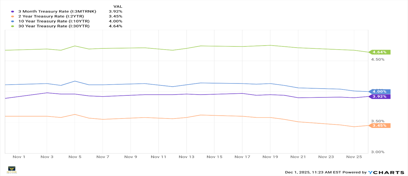 Treasury yields moved modestly lower across the curve in November, reflecting a continued shift in market expectations toward a December rate cut and softer macroeconomic conditions.